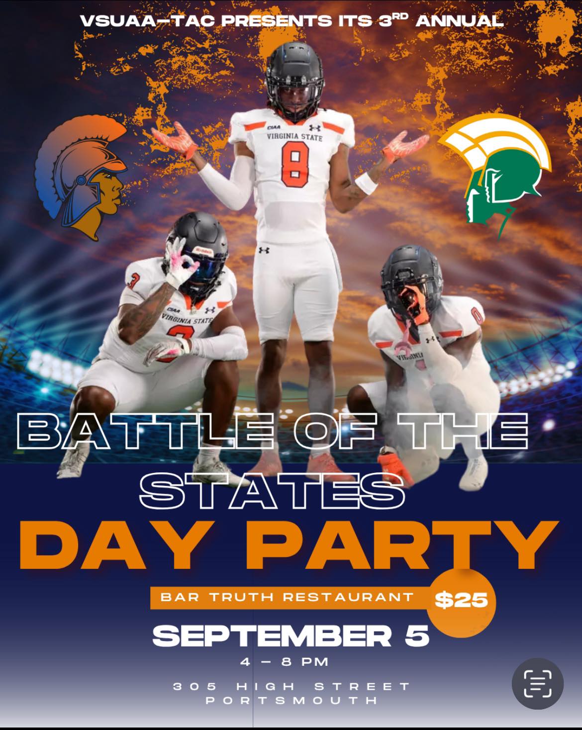 Join the VSUAA Tidewater Alumni Chapter as we kick off Labor Day weekend at our Annual Battle of the States Day Party on Friday, September 5, 2025, from 4 PM- 8 PM at Truth Restaurant & Lounge in Portsmouth, VA.